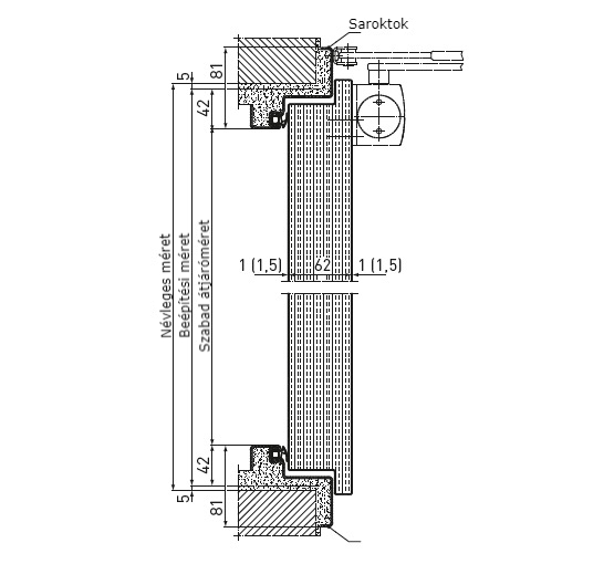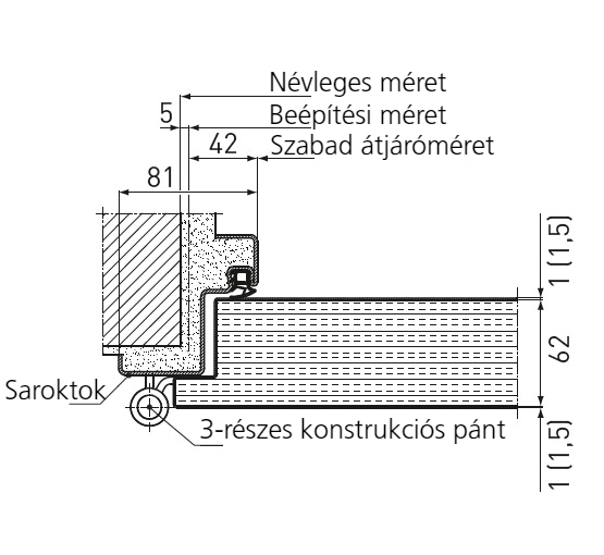 1 db 3-részes konstrukciós pánt és 1 db rugós pánt, (Ei90 típusnál: rugós pánt max. 1 m² -ig, a felett 2 db 3-részes konstrukciós pánt és felső ajtócsukó), RAL 9016 fehér színre porszórva; opcionálisan rozsdamentes vagy 3D-s állítható pántok; 1750 mm magasságig 1 db kiemelésgátló biztonsági csap; biztonsági PZ-váltózár, fekete rendszerkilincs; cilinderbetét nélkül, mely a megrendelő által biztosítandó. (mérete: 85 mm, 35/50 mm)