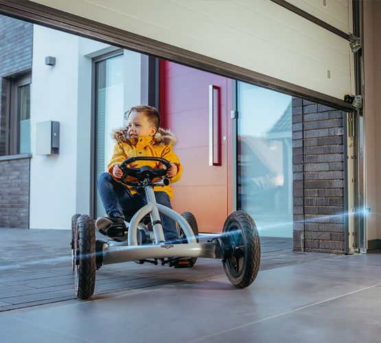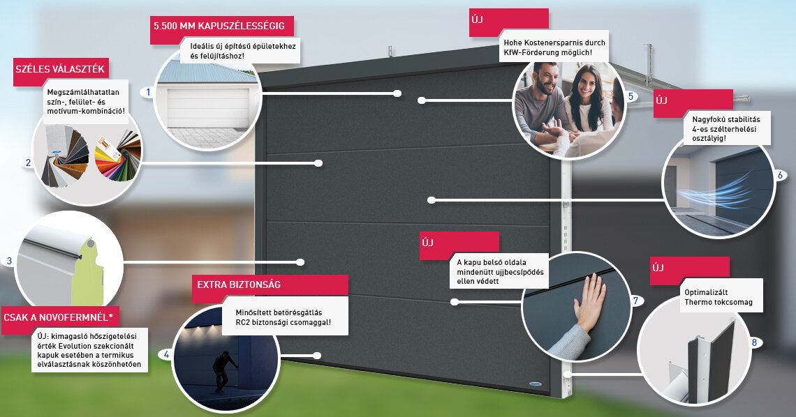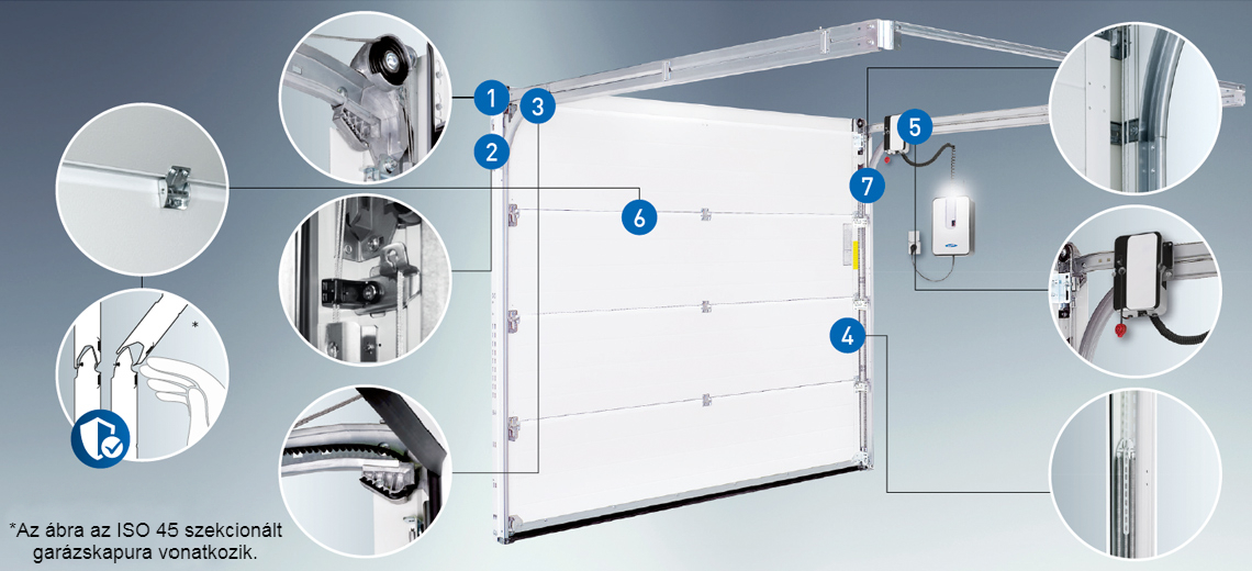 A szekciók és pántok speciális kialakítása eleve kizárja, hogy bármi becsípődjön a kapulap elemei közé.
