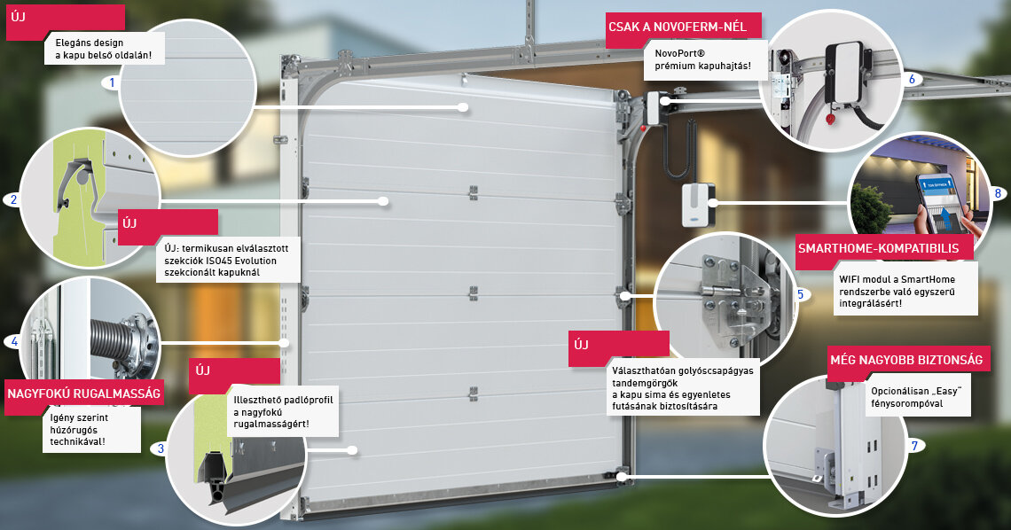 A NovoPort® kapuhajtás rendszert nem csak kényelmes kezelhetősége jellemzi, hanem számos beszereléshez kapcsolódó előnyös tulajdonsága is. A motor nem a más hajtásoknál szokásos módon felül, hanem az oldalsó kapuvezető sínbe integráltan helyezkedik el, a beépítési lehetőségektől függően jobb vagy baloldalon. Így a mennyezet szabadon marad.