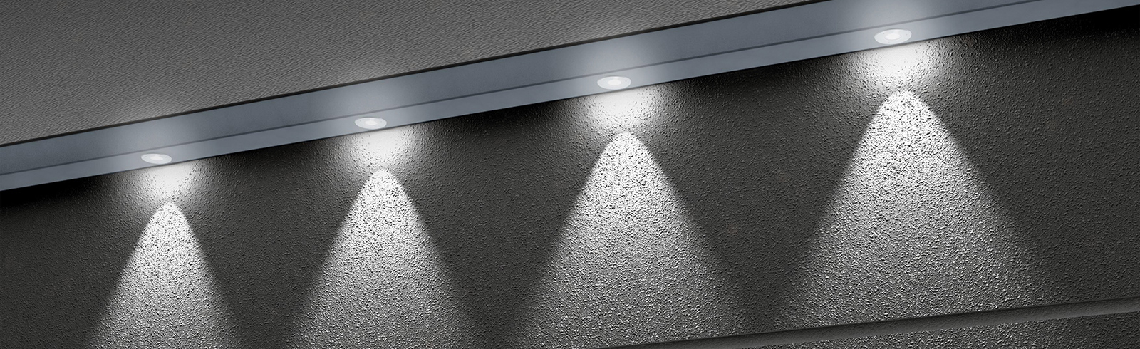 A homlokzatot hangulatossá teszi a garázskapu fölötti LED világítás. A világító egységcsomag mindössze 2 cm magas és 4 cm széles, így olyan kevés helyet foglal el a garázs homlokfalából, hogy csaknem a teljes áthajtási magasság szabad marad.