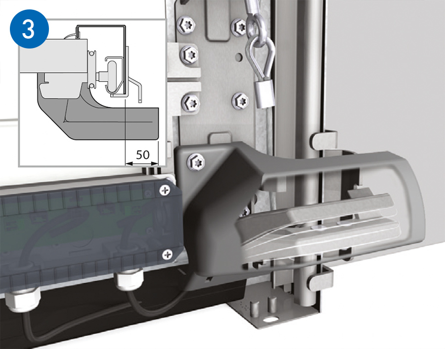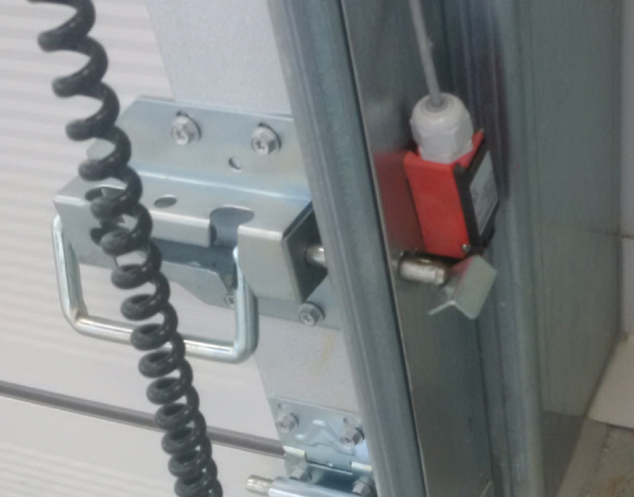 A tolózár a futósínbe reteszel, ezáltal a kapu nem nyitható ki, és a mikrokapcsoló kikapcsolja a hajtás funkcióját.
