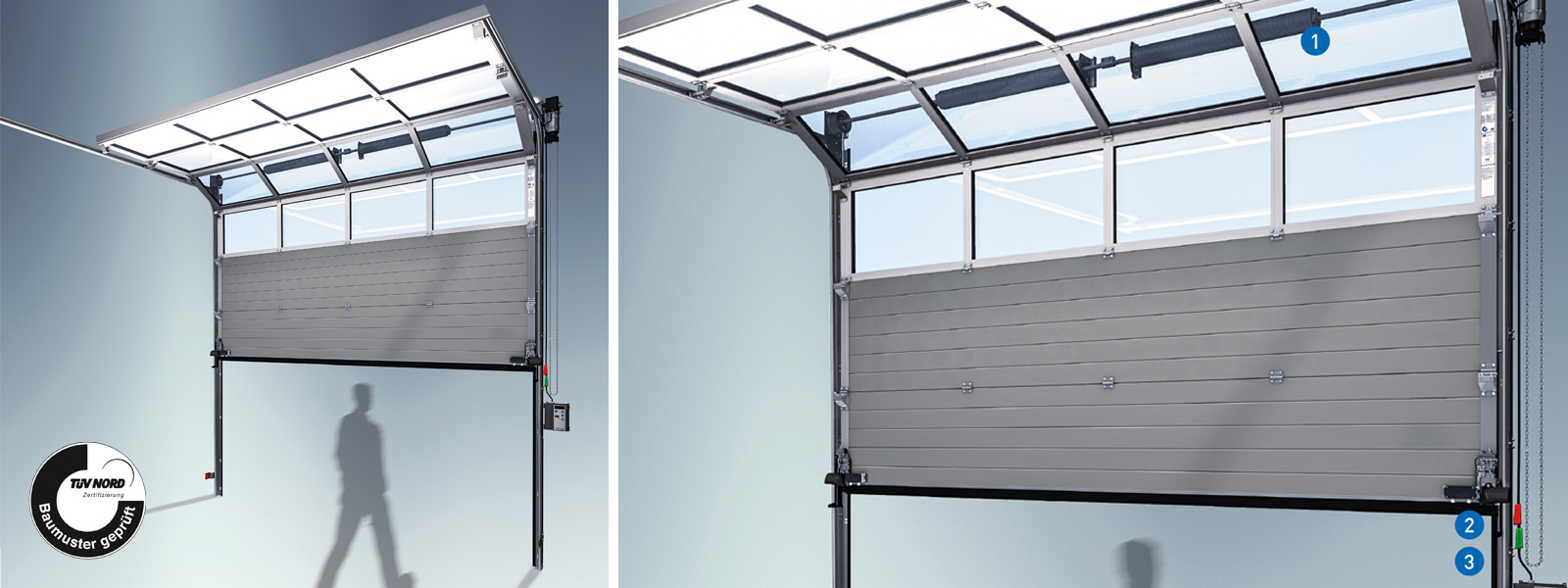 A biztonságos működés a felfelé nyíló, nagy súlyú szekcionált kapuknál központi kérdés. A Novoferm mechanikus és elektronikus biztonsági berendezések széles választékát kínálja, melyek mind azt a célt szolgálják, hogy a kapu ne okozzon sérülést az emberekben, járművekben vagy más, az útját akadályozó tárgyakon. A szekcionált kapu túlbiztosítása azonban teljesen felesleges, és még hátránnyal is járhat, pl. a kapu beszereléséhez, használatához vagy karbantartásához a szokásosnál nagyobb helyre lenne szükség, esetleg az egységek egymást is akadályozhatják. Mi a Novofermnél éppen ezért azt javasoljuk, hogy elsősorban az érvényben lévő szabályozások szerint járjanak el. Ezeknek megfelelve optimális biztonsági rendszereket kínálunk, melyeket a TÜV Nord vizsgáló intézet minősített, és megfelelnek a legszigorúbb szabványi követelményeknek.