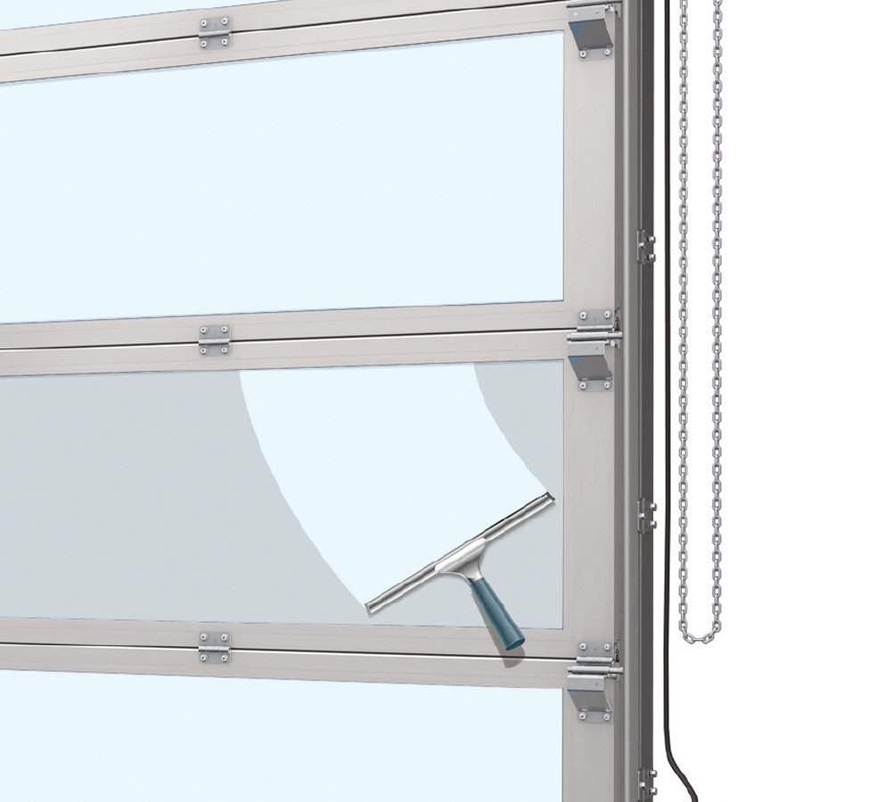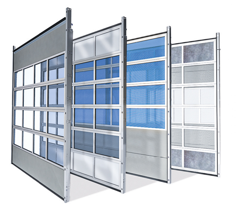 A Novolux 40 szekcionált ipari kapukat igény szerint különböző minőségű, hőszigetelési értékű, színű és struktúrájú műanyag ablakok széles választékával lehet felszerelni.