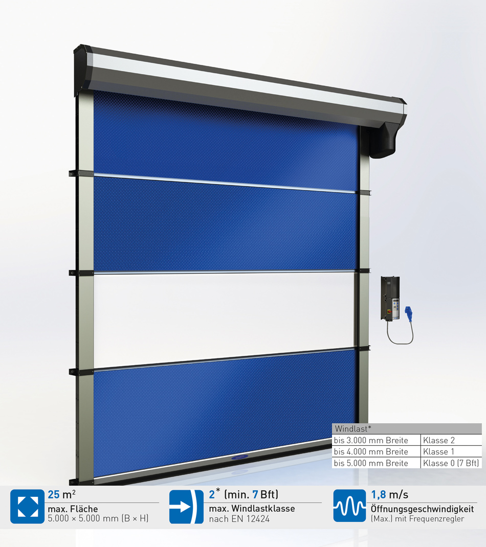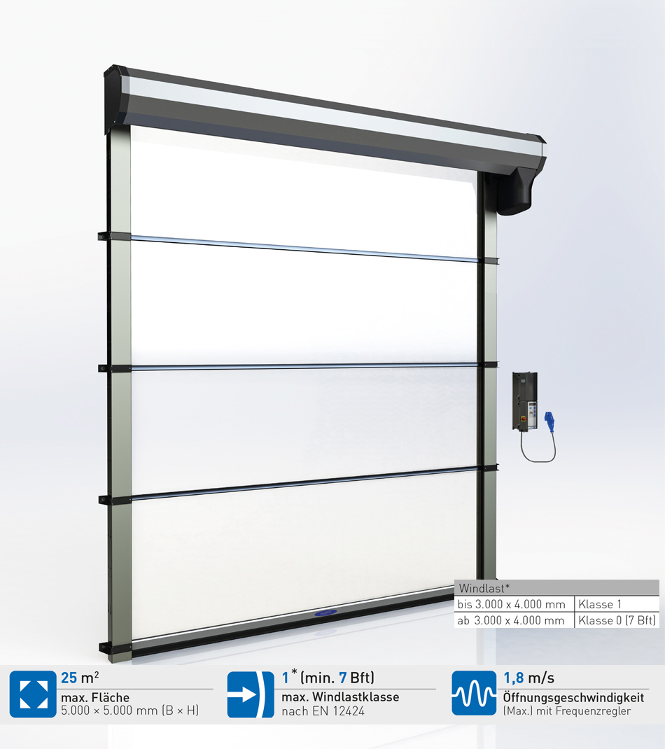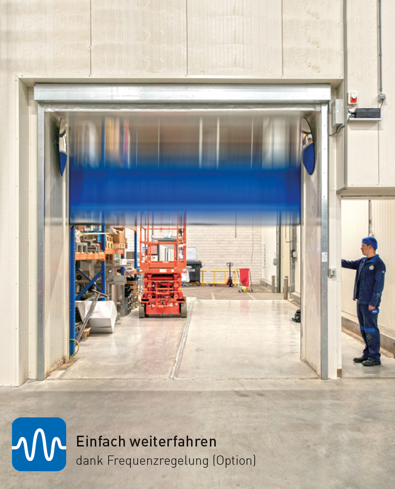 - GYORS: A Strong-E ideális az intenzív gyalogos- vagy járműforgalom részére, még nagyobb szélnyomású átjárókban is, például gyártócsarnokokban.