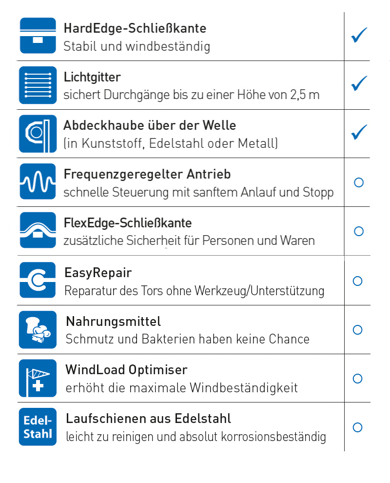 Az ÉLELMISZERIPARBAN gyors, megbízható és higiénikus kapukra van szükség. Ilyen helyzetekben a SPEEDROLLER STRONG a tökéletes megoldás: gyors az opcionális frekvenciavezérlésnek köszönhetően, megbízható a kiegészítő megerősítő profilokkal ellátott, robusztus tartószerkezetnek köszönhetően, higiénikus az opcionális rozsdamentes acél vezetősíneknek, a burkolt zsanéroknak és a penészálló tömítéseknek köszönhetően.