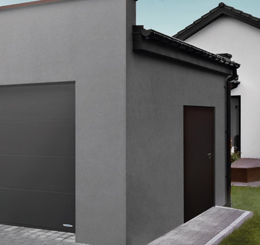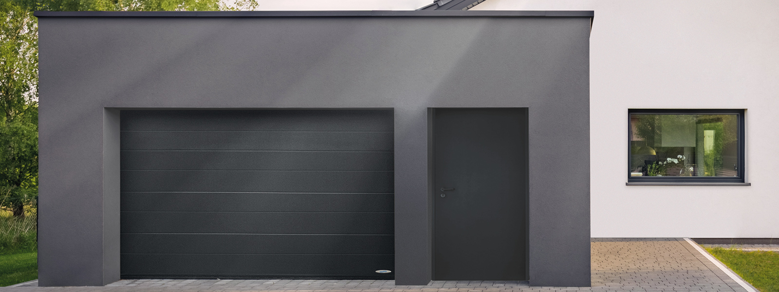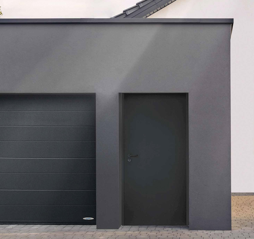 Garázs-mellékajtóként antracitszürke (~RAL 7016) színben.