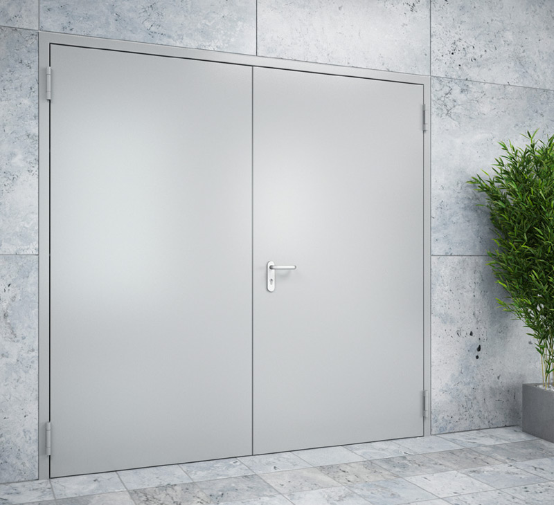 - Kétszárnyú ajtók síkban záródó ajtószárnyakkal, integrált középső ütközőelemmel