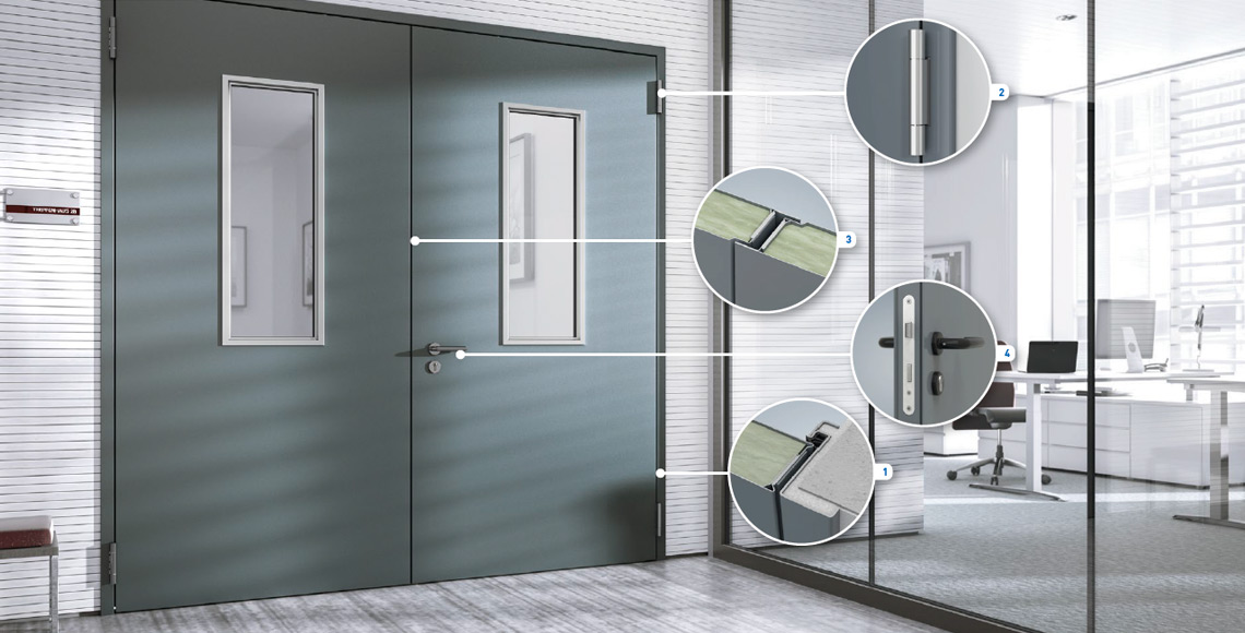 - Változatos lehetőségek már standard kivitelben is (ajtócsukó Ei30 típusnál, 3D-s pántok, rozsdamentes zárelőlap és zárellenlemez, műanyag, körcímes kilincsgarnitúra