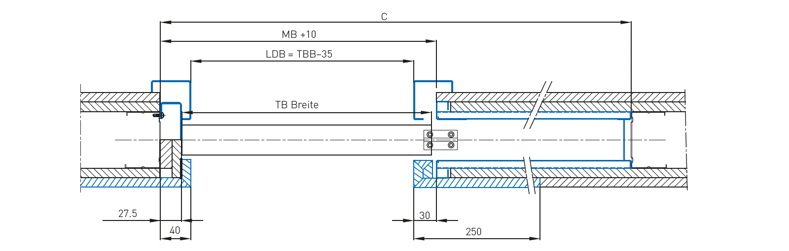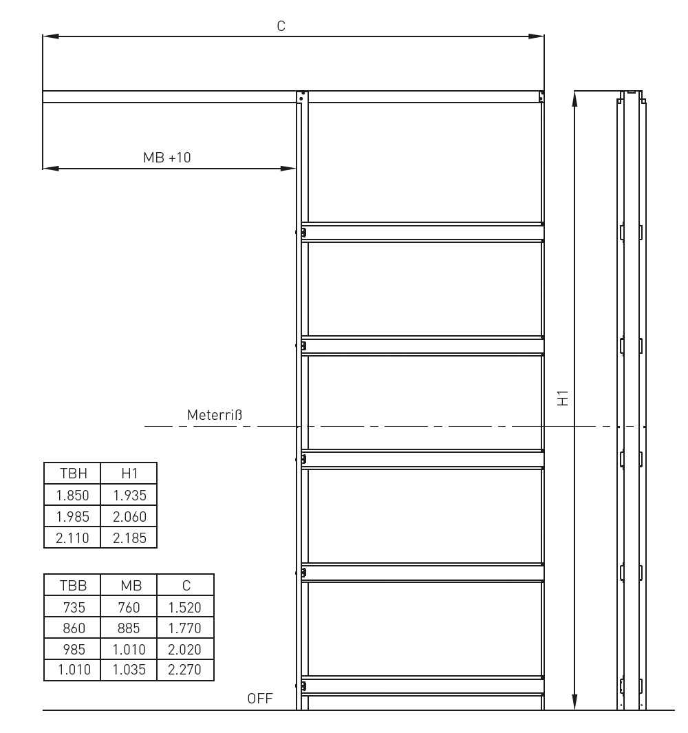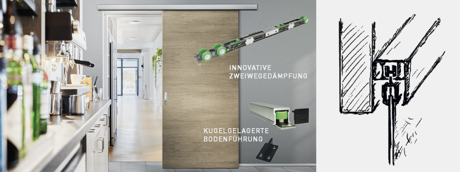 A sínrendszer 610 mm szélességtől kétoldali nyitás-zárás csillapítással rendelkezik 80 kg-os ajtólap súlyig. Az ajtólap végpozíciója az aktivátorok egyszerű elhelyezésével a futósínben állítható be, és utólag is módosítható. A függőleges profilokba integrált méterjelölés megkönnyíti a kész padlószinthez történő beállítást.