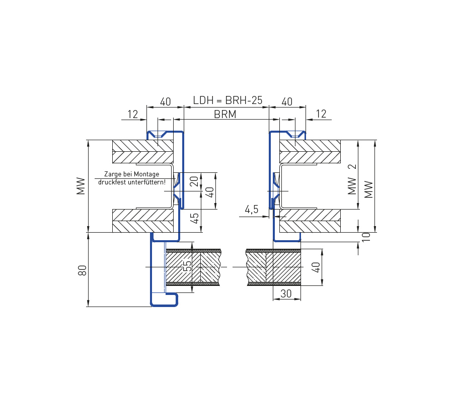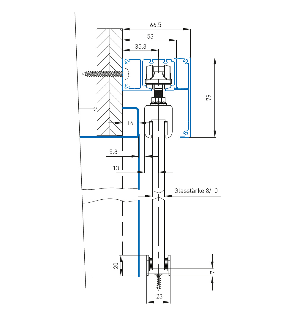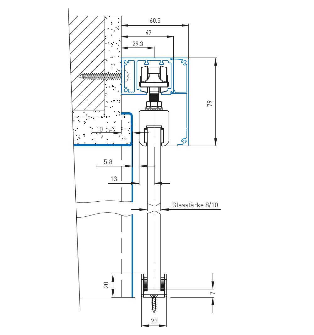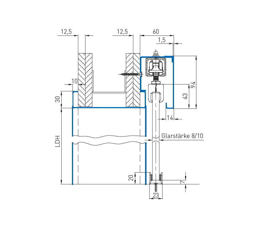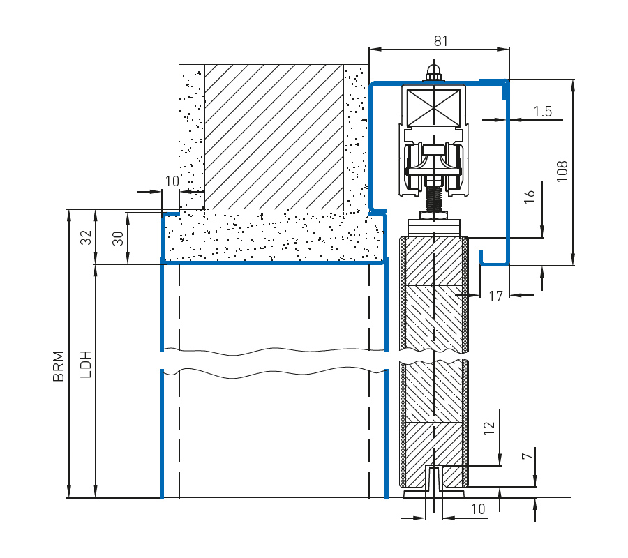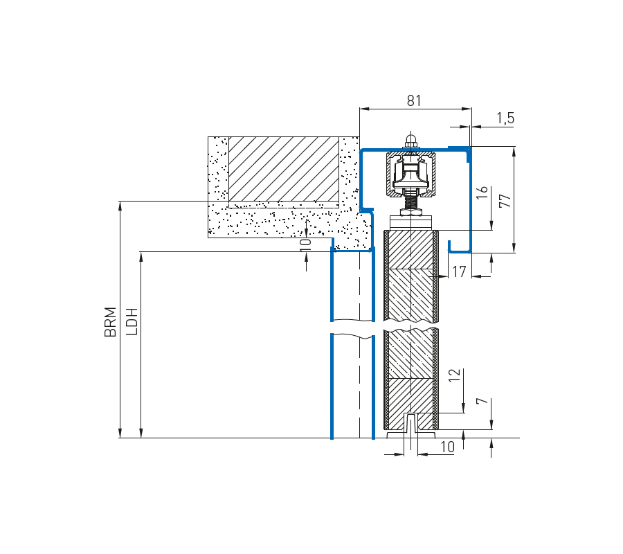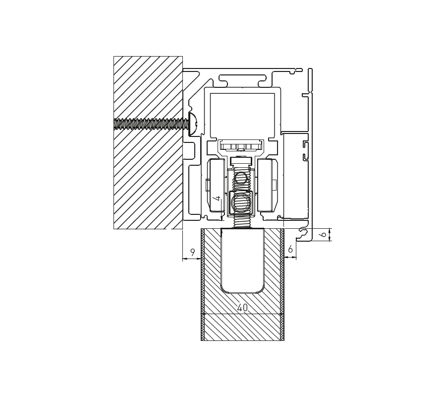 A sínrendszer 580 mm szélességtől kétoldali nyitás-zárás csillapítással rendelkezik 80 kg-os ajtólap súlyig. Az ajtólap végpozíciója az aktivátorok egyszerű elhelyezésével a futósínben állítható be, és utólag is módosítható. A profil egymástól 250 mm-es távolságban van előfúrva.