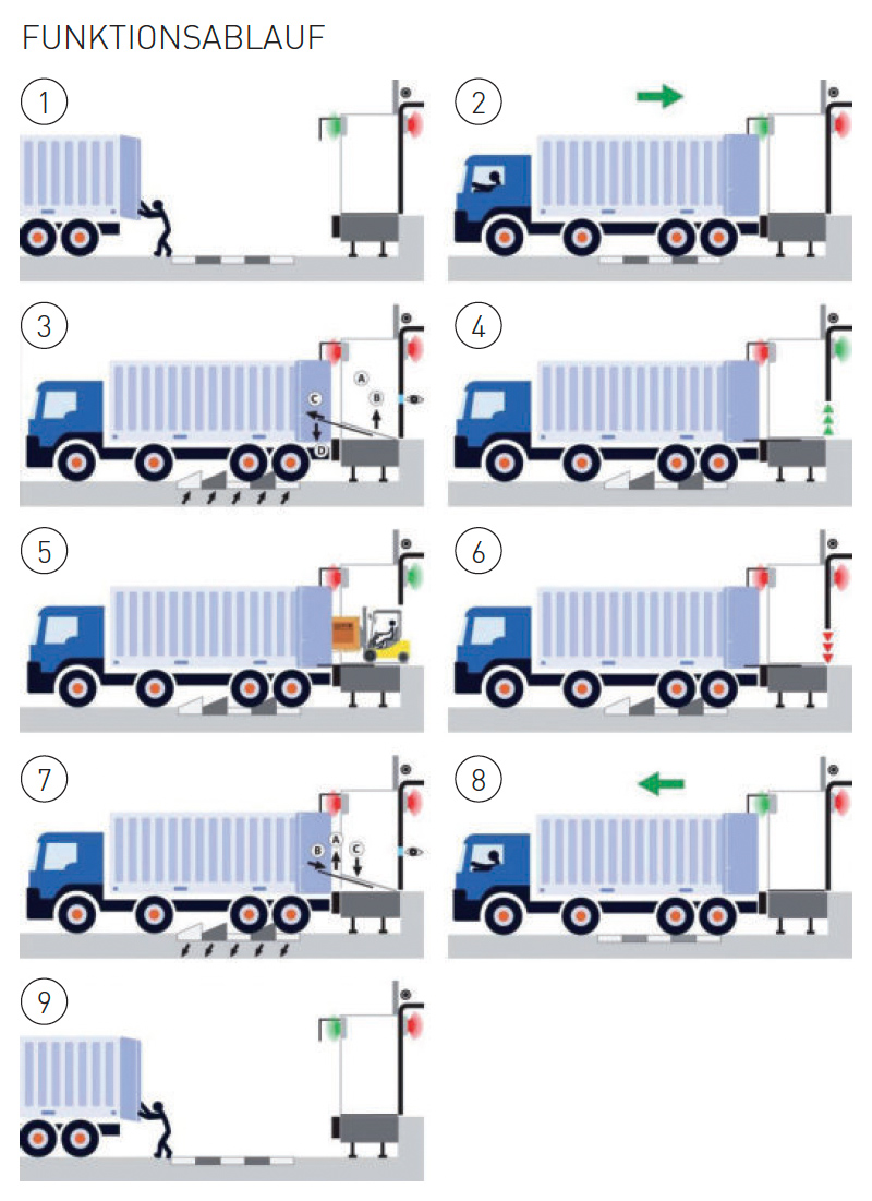 Éppen ezért elektronikus kerékék használatát javasoljuk, melyek összeköttetésben vannak a kapuval, illetve a rakodóhíddal. Csak akkor lehet megkezdeni a rakodást, ha az ék a kerék mögött a megfelelő pozícióban van.