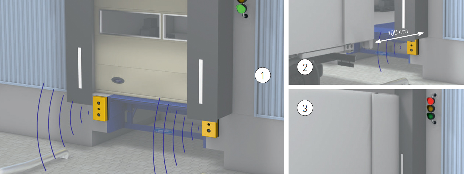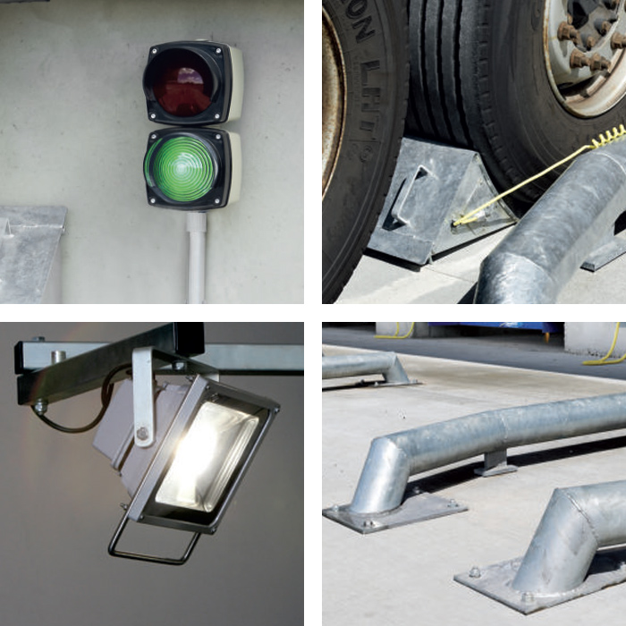 A jelzőlámpák tájékoztatják egyrészről a külső oldalon a gépkocsivezetőt, másrészről a belső oldalon a személyzetet, hogy a rakodóegység szabad-e, illetve készen áll-e a rakodás megkezdésére.